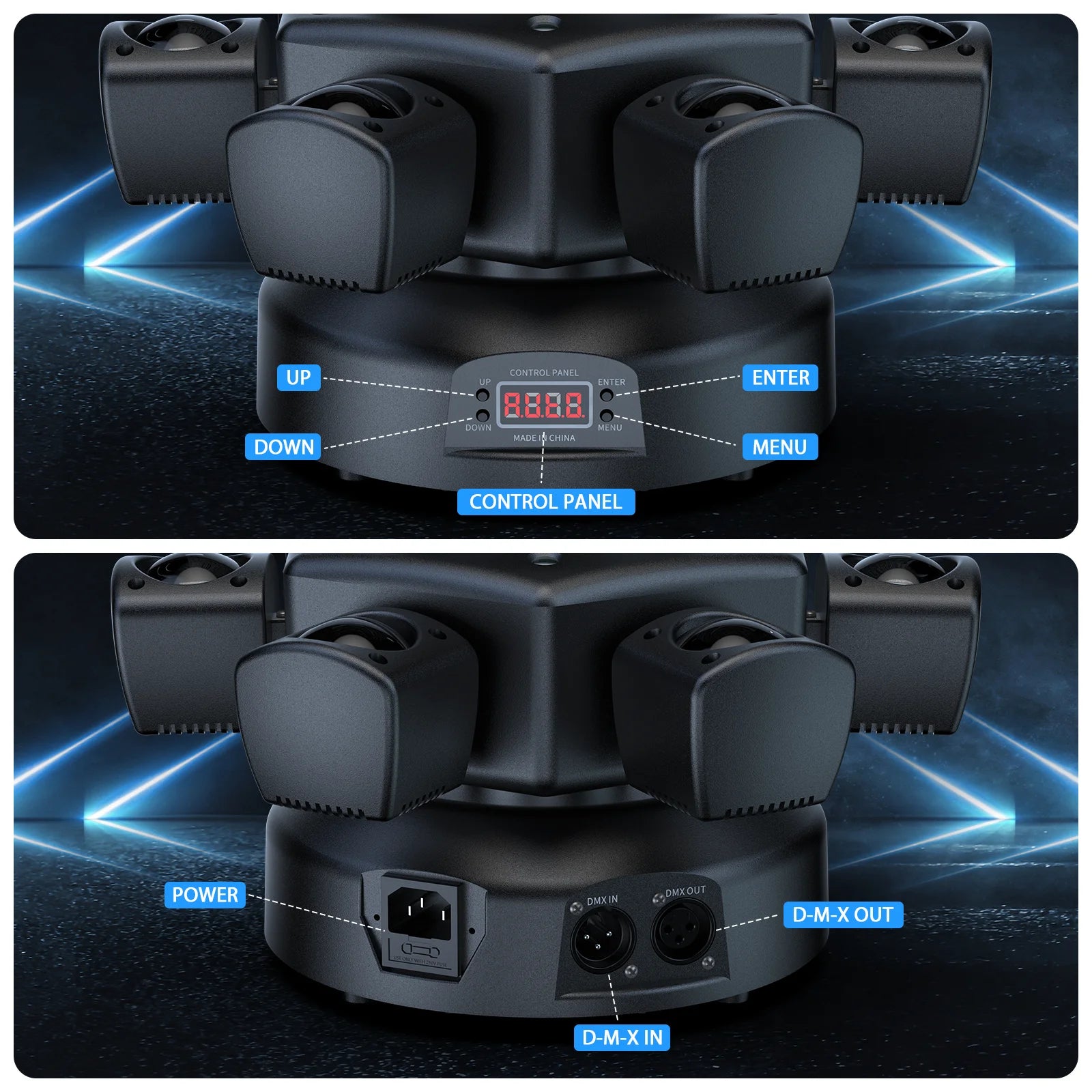 Dynamic 6-Arm System: Four-in-one rotating arms with 180° tilt and 540° pan create 360° dynamic effects for clubs, parties, and events.