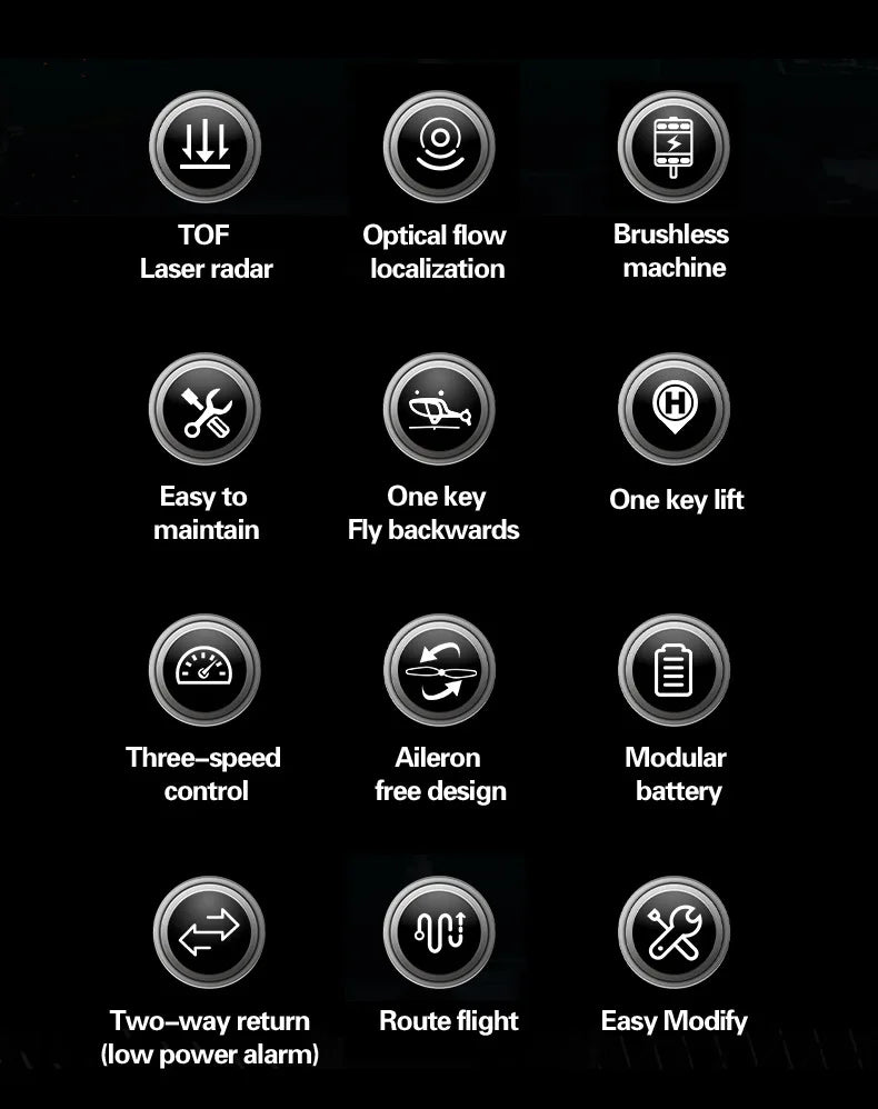 Multiple flight functions: ascent, descent, forward, backward, left/right roll, rotation, route flight, and more