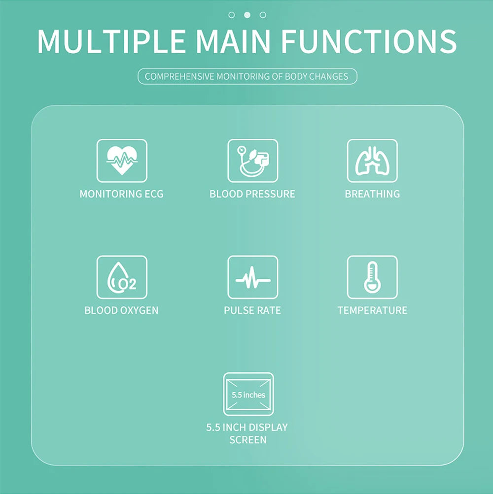 Tracks ECG, blood pressure, blood oxygen, temperature, and respiration