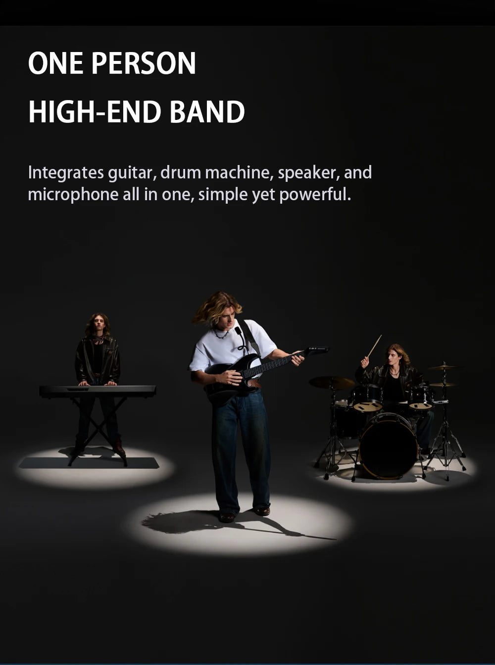 Take your music anywhere with this portable black electric guitar bundle. Complete with a carry bag, external mic, and powerful built-in speaker, it delivers premium sound and smart features in a travel-ready design.
