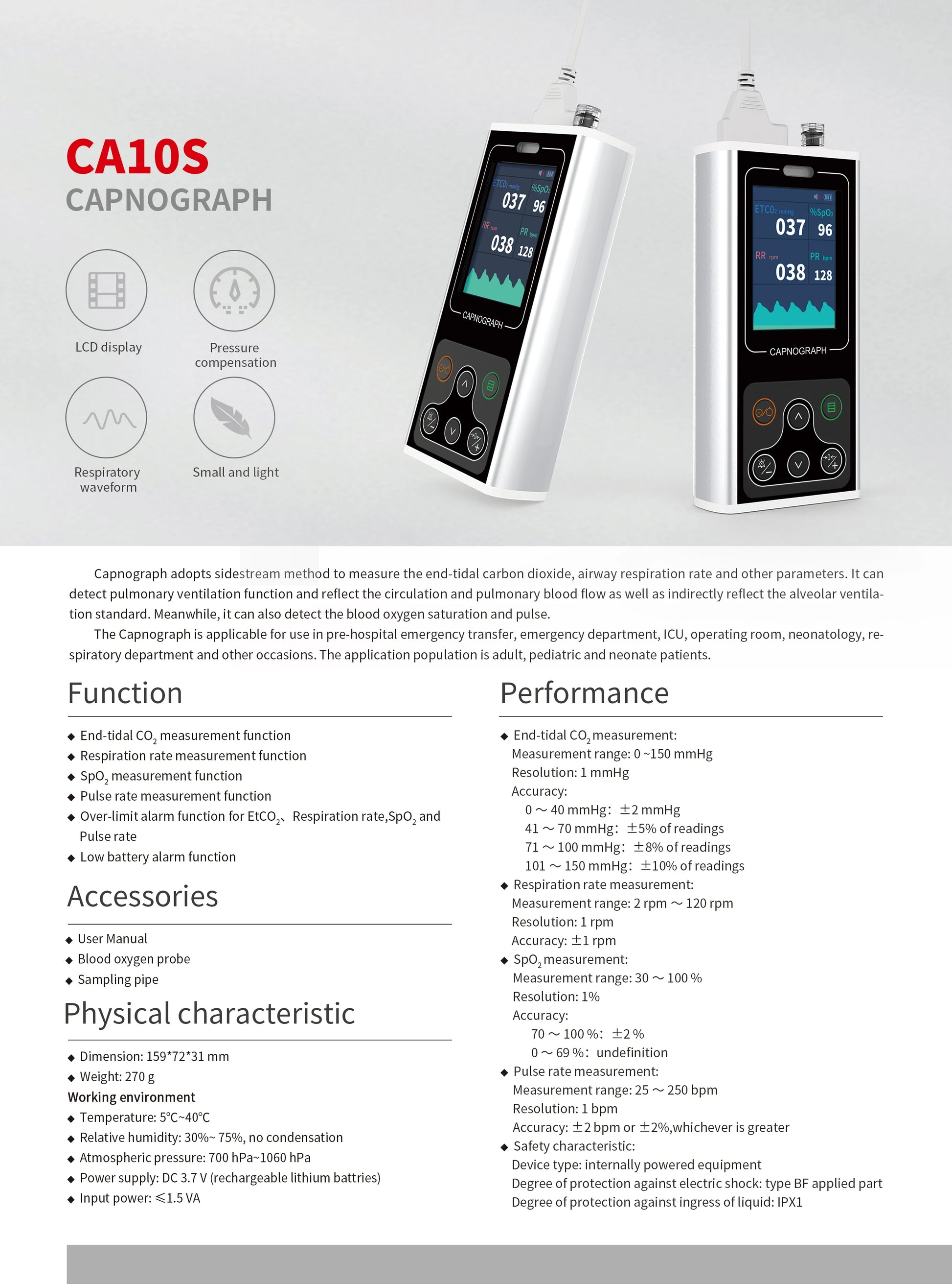 Respiration Rate Range: 2–120 rpm, accuracy ±1 rpm