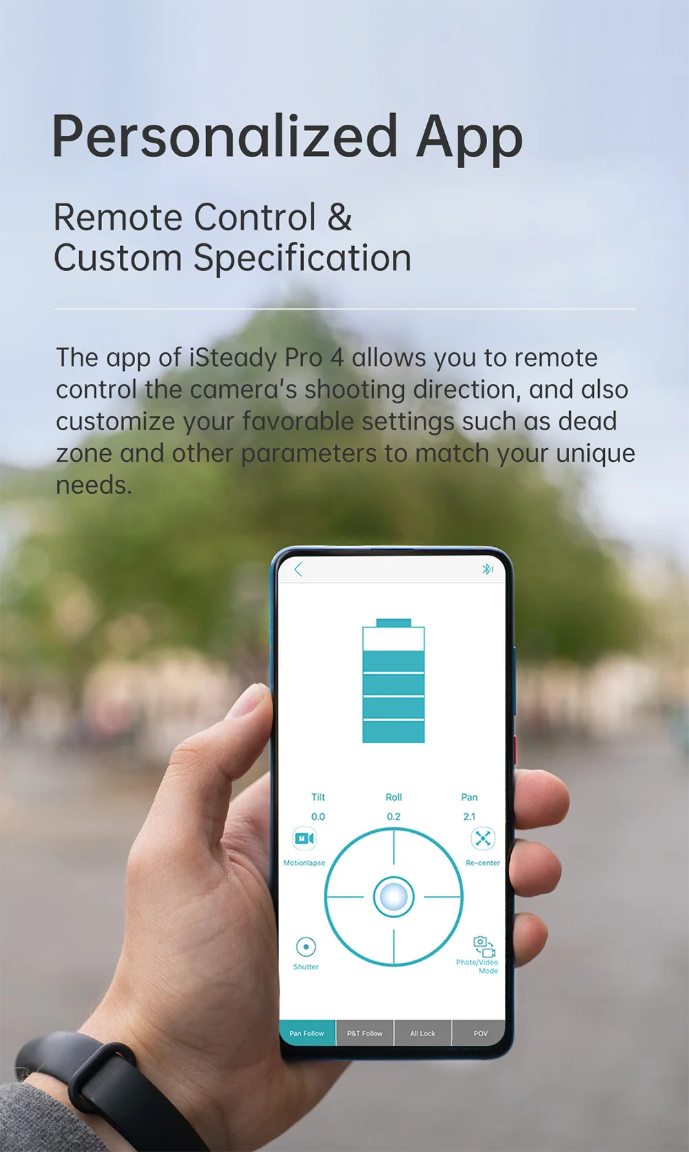 Multiple Shooting Modes: Switch between pan, tilt, lock, and follow modes for creative flexibility.