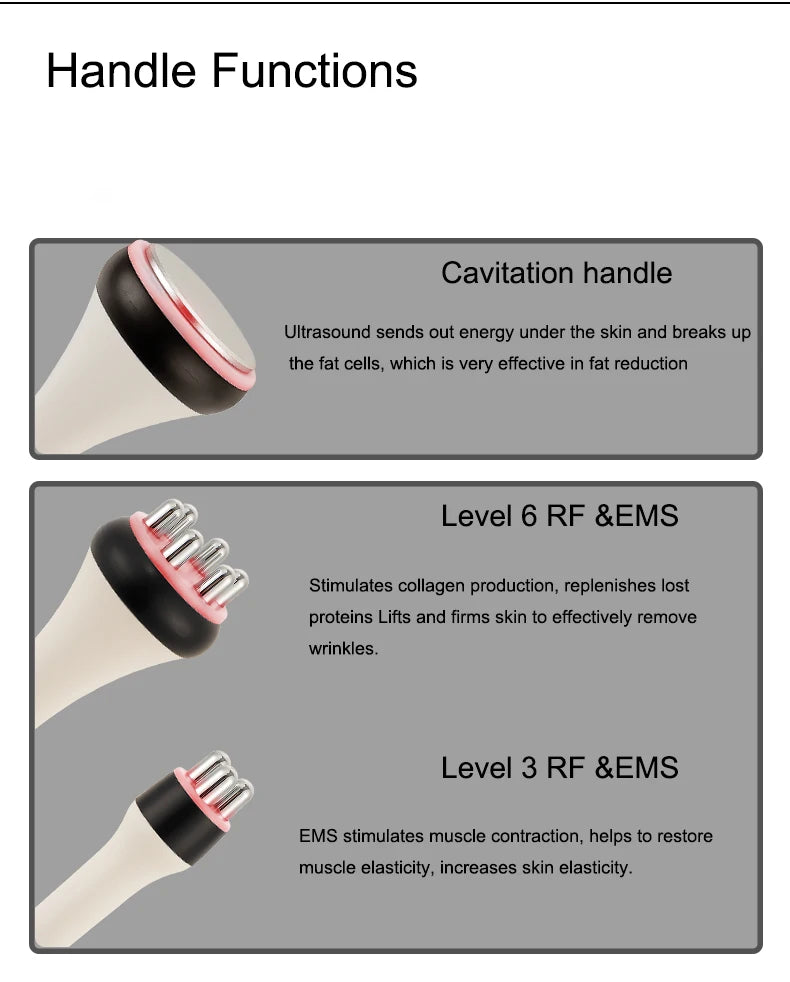 Bring advanced body shaping and skin rejuvenation into your daily routine with this sleek white cavitation beauty machine. It uses powerful ultrasonic waves and radio frequency technology to target fat, lift the skin, and restore a smoother, firmer look.