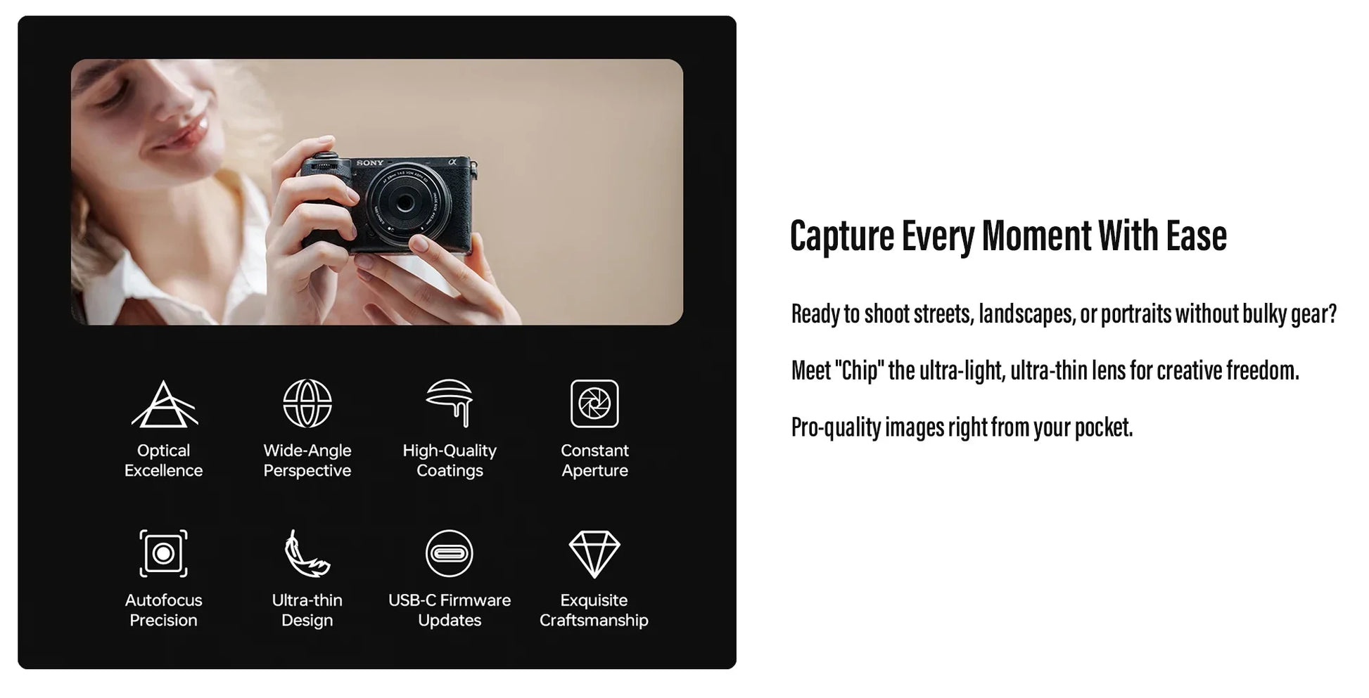 A reliable wide-angle prime with sharp autofocus, this lens is perfect for capturing more in every frame. It’s an affordable way to expand your Sony setup with a travel-friendly, high-quality lens.