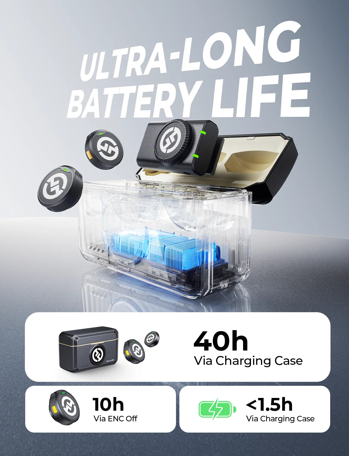 Long-lasting battery life up to 40 hours with charging case